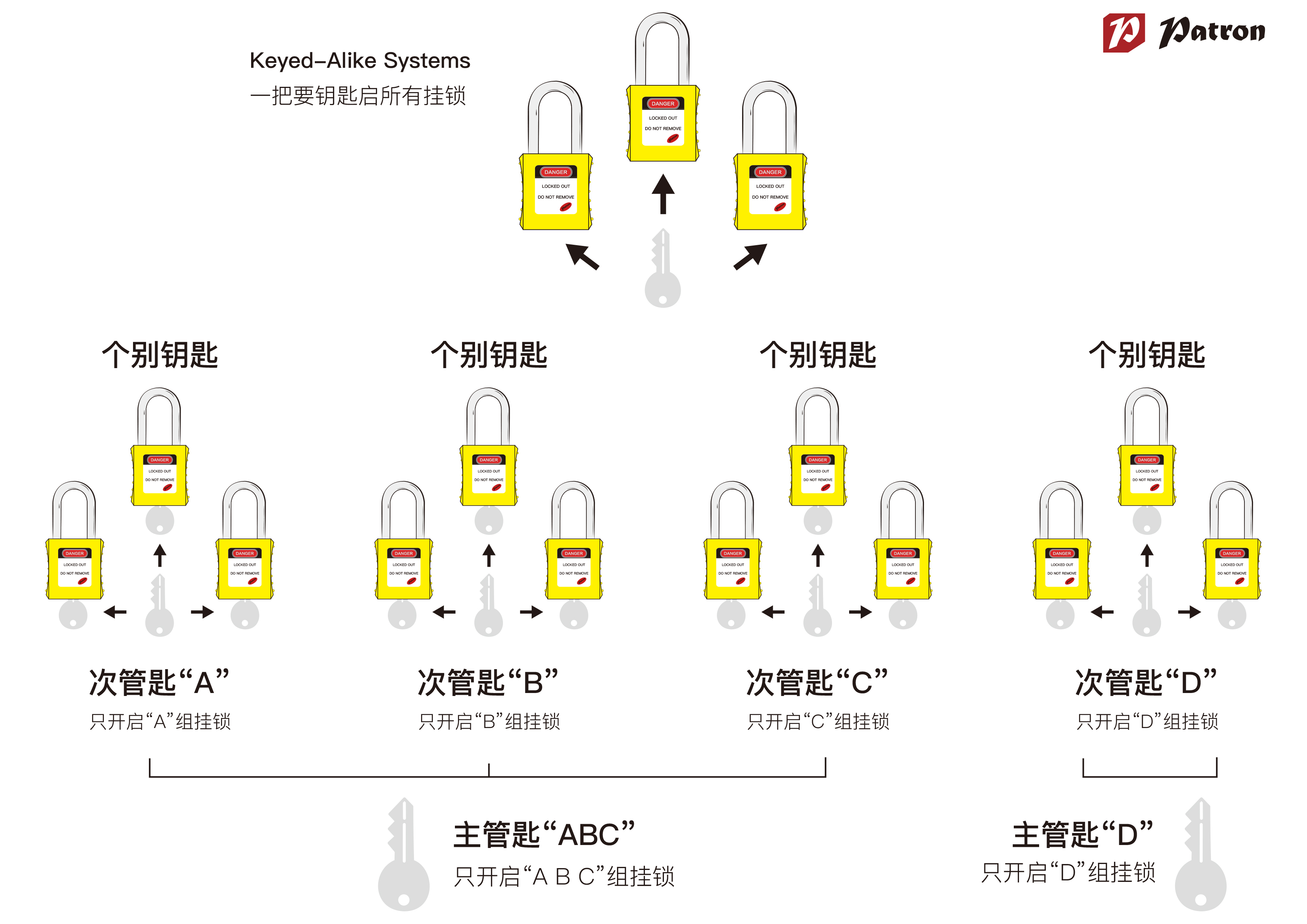 在大型的生產(chǎn)埸地中往往遇上一個工程師操控多臺設(shè)備的情況。傳統(tǒng)上,他們將需要單獨的鑰匙來打開每把掛鎖,這樣對工程師來說自然增加額外的操作時間和其他的不方便。這時一套鉑鉺盾(Patron)相同鑰匙牙花的安全掛鎖便讓這項工作變得非常容易。