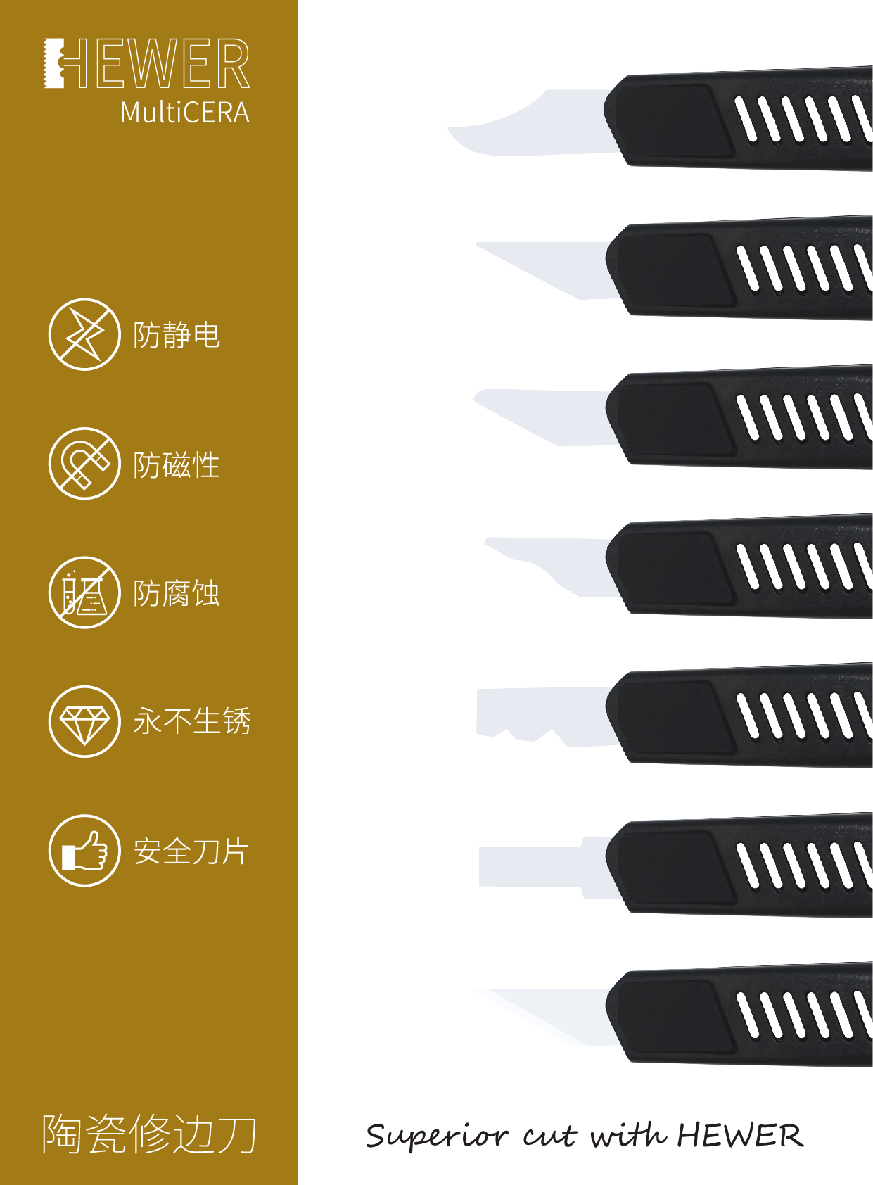 HEWER MultiCERA 安全陶瓷修邊刀可配合多款不同形狀的刀片使用,讓您在不同角度下進(jìn)行工作。而其刀柄除了采用超耐用的玻璃尼龍材質(zhì),還附有備用刀片庫,可讓您輕易地在多款刀片之間進(jìn)行切換,方便又好用!HEWER MultiCERA 安全陶瓷修邊刀擁有特別設(shè)計(jì)的纖細(xì)刀柄,可讓您以各種刁鉆的角度,將刀片伸至許多難以觸及的地方來進(jìn)行切割作業(yè)。